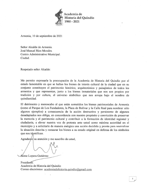 El detrimento y menoscabo al que están sometidos los bienes patrimoniales de Armenia (como el Parque de Los Fundadores, la Plaza de Bolívar y la Calle Real para nombrar sólo algunos ejemplos) a consecuencia de la acción destructiva y persistente de algunos desadaptados nos obliga, en concordancia con nuestro propósito y convicción de preservar la memoria y el patrimonio cultural y contribuir a la formación de identidad regional y ciudadanía, a elevar nuestra voz de protesta ante usted como máxima autoridad en el municipio y a solicitarle de manera enérgica una acción decidida y pronta para neutralizar la situación descrita y restaurar los bienes a su estado original en defensa de los símbolos que nos identifican.